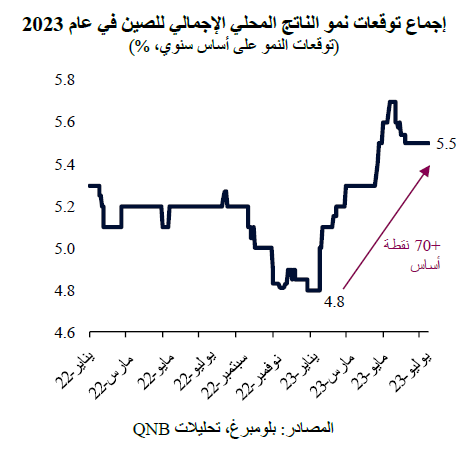 في وقت مبكر من العام الحالي، كانت الصين أحد الأسباب الرئيسية وراء توقعاتنا التي تفوق إجماع التوقعات بشأن النمو العالمي لعام 2023. هيمنت الرؤى السلبية من قبل المستثمرين والمحللين على الأجندة الاقتصادية، حيث أشارت توقعات بلومبرغ إلى تعافٍ صيني بطيء تبلغ نسبته 4.8% بعد أداء ضعيف في عام 2022. إجماع بلومبرغ هو أداة لرصد التوقعات العالمية للاقتصاديين ومراكز الفكر ودور الأبحاث، وتقدم مجموعة من التوقعات بالإضافة إلى نقطة متوسطة لتوقعات السوق.